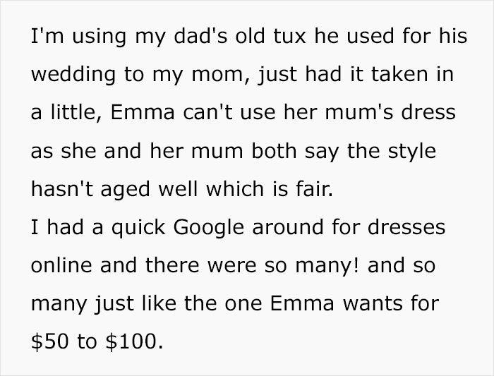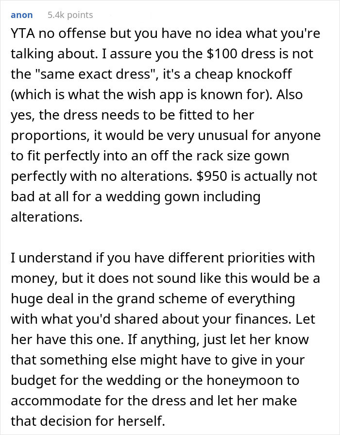Without a doubt, this couple would have to go through disagreements about money in the future. OP’s solution is to immediately resort to vetos, a strategy that is manipulative and short-sighted even in the cut-throat world of business. In a relationship, it’s just downright cruel. Even worse, instead of hearing her out, OP began calling her names and comparing the old tuxedo he would use to a dress from Wish. This was over a few hundred dollars, which isn’t that small of a sum, but nowhere close to the money a couple would be expected to manage in the future.