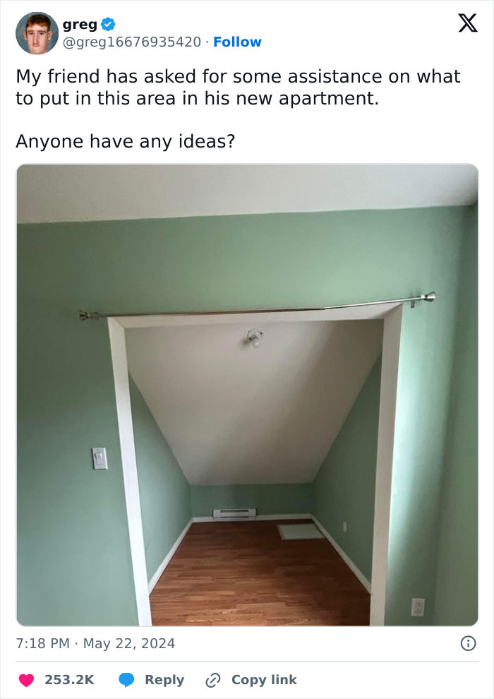 Popular content creator Greg, aka @greg16676935420, recently entertained us all on social media. He posted a photo of a small space in his friend’s new apartment and asked everyone to share their ideas for what he should put there. The users of X (formerly Twitter) had a lot of fun sharing their witty interior design decisions. We’ve collected some of the best and funniest ones, so be sure to scroll down to check them out!