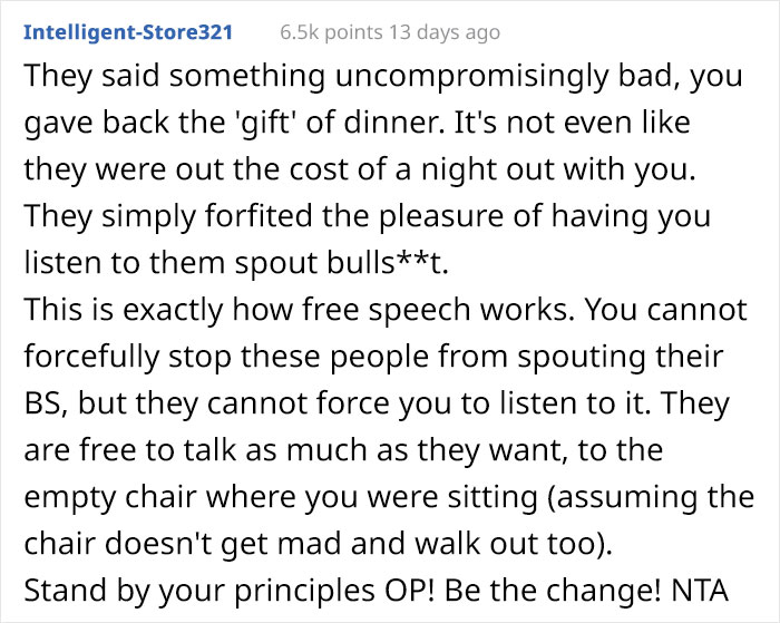 Reddit users overwhelmingly supported the author of the story. Here’s what they had to say about his reaction during dinner
