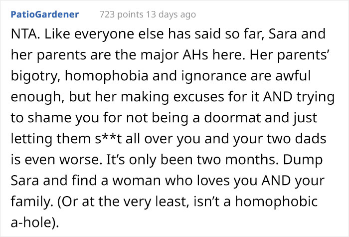 The redditor’s girlfriend’s parents were incredibly judgmental of his brother and his partner, and their comments were practically oozing homophobia. They referred to being gay as “bad habits” and called the young adult’s brother “perverted.”