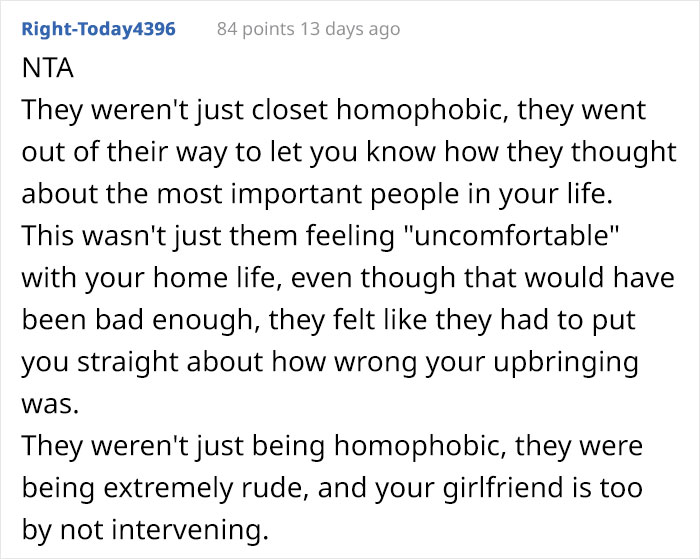 Load More Replies...Was it his best moment? Probably not. But then again we're not required to be our best selves 24/7. It was his authentic self, and he is under no obligation to tolerate continued rudeness. Sympathy for losing his parents at such a young age would have been appropriate, but no, they had to double down on the homophobia. I hope the OP is on to someone new who loves him *and* his family.