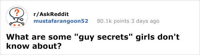 Does the Loch Ness Monster really exist? What happened to the crew of Mary Celeste? And what are guys up to when they're taking long showers? While we might never find out the answers to the first two mysteries, the latter has just been revealed. Together with a bunch of other men secrets most girls probably have no clue about. Recently, someone on reddit asked "What Are Some 'Guy Secrets' Girls Don't Know About?" and it got funnier and funnier with every answer. Amassing over 80K upvotes in just a few days, this post has become sort of like a diary of the 21st century man, and you couldn't make this stuff up. Scroll down to check out the entries and upvote your faves!