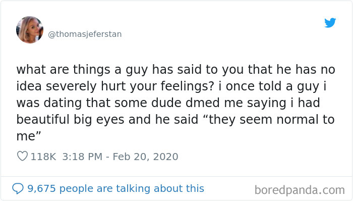 When one young woman asked people on Twitter "what are things a guy has said to you that he has no idea severely hurt your feelings?" dozens of people delivered. While we're not saying that only guys say offensive things, this list is precisely about that—30 people sharing the times that a man has hurt their feelings without being aware of it. So scroll down to see the full list and tell us in the comments below whether * you * have ever been offended by a guy who thought he was just being honest!