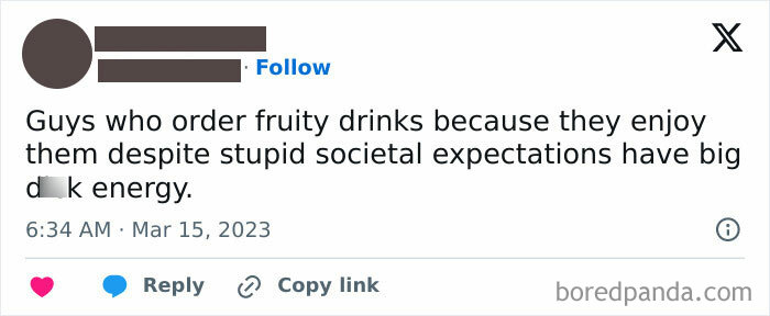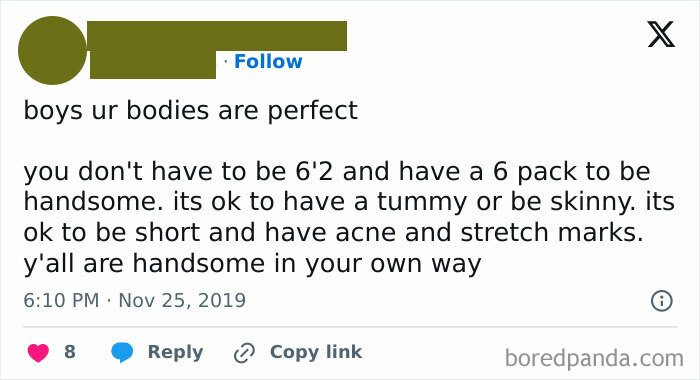 Right, bois, bros, men, listen to me right now. After reading this, you will get up and you will get a drink of water. This is non-negotiable. I will mangle your pre-frontal cortexes. While you’re up, find a mirror and appreciate yourself. I must say, your eyes are beautiful. That is not a lie, and not a general term directed to all the men reading this. That compliment is directed to you and you alone. Accept it. Now take a moment to contemplate the fall of humanity before returning to what you were doing before. Thank you. And to my grls, sis, women, give your bois a compliment. It doesn’t have to be anything drastic.