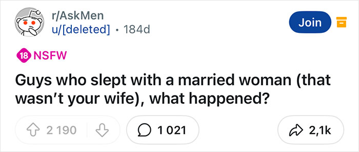 As you likely already saw, this list is made up of stories coming from men who slept with women who were married, but to someone else. All of these confessions came from a Reddit thread that was popular enough a few months ago to get over 1K responses. All of these responses made us wonder – why do people cheat in relationships? So, we delved into this topic a little deeper.