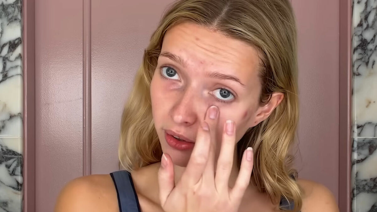 The model began the video by de-puffing her face with ice, then applied toner, anti-blemish cream, scar repair serum, and moisturizer before moving on to makeup.