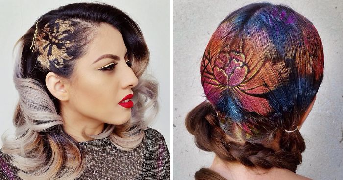 Janine Ker is a hairstylist who uses her artistic background to create gorgeous hair art. Just like a street artist, she paints over stencils with vibrant colors.