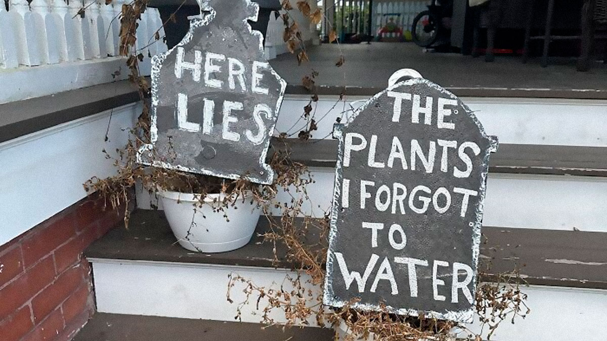 Dollar Tree Styrofoam Gravestones Flipped Over With Silver Marker + The Dead Plants You Still Haven’t Thrown Out From The Summer