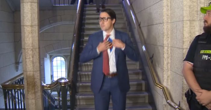 After addressing the House of Commons in Canada’s parliament, Trudeau was spotted walking down a flight of stairs to greet press from Global News. After reaching the last step, he moved his tie aside, opened his white dress shirt, and revealed a Superman costume underneath – and then simply kept walking. The fact that he had spent the whole day wearing clunky Clark Kent-style glasses only made it all more convincing.