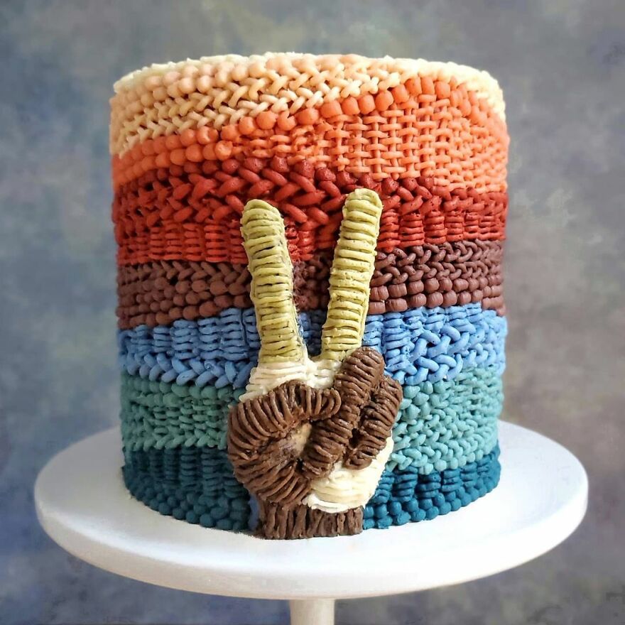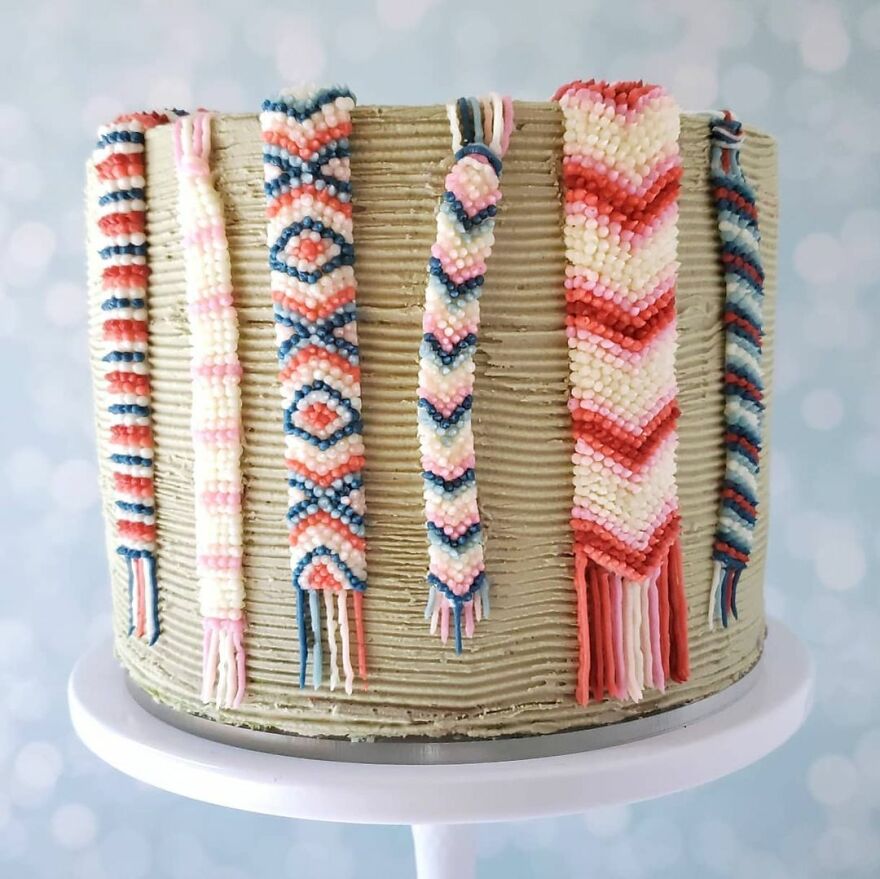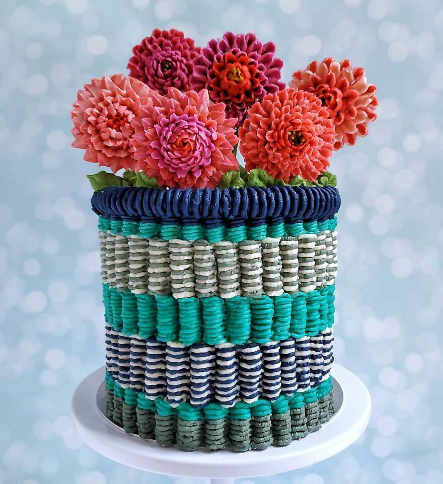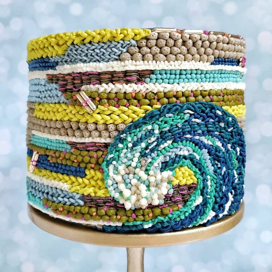 “Over time, I refined my decorating skills and found some styles that I am really passionate about. I just love the texture and dimension of knit/woven/macrame designs on a cake. I am definitely not the first decorator to put some sort of "fiber art" decoration on a cake, but I think I have a particular style and color palettes that make my designs unique. All my designs are piped (using bags and piping tips) in buttercream.”