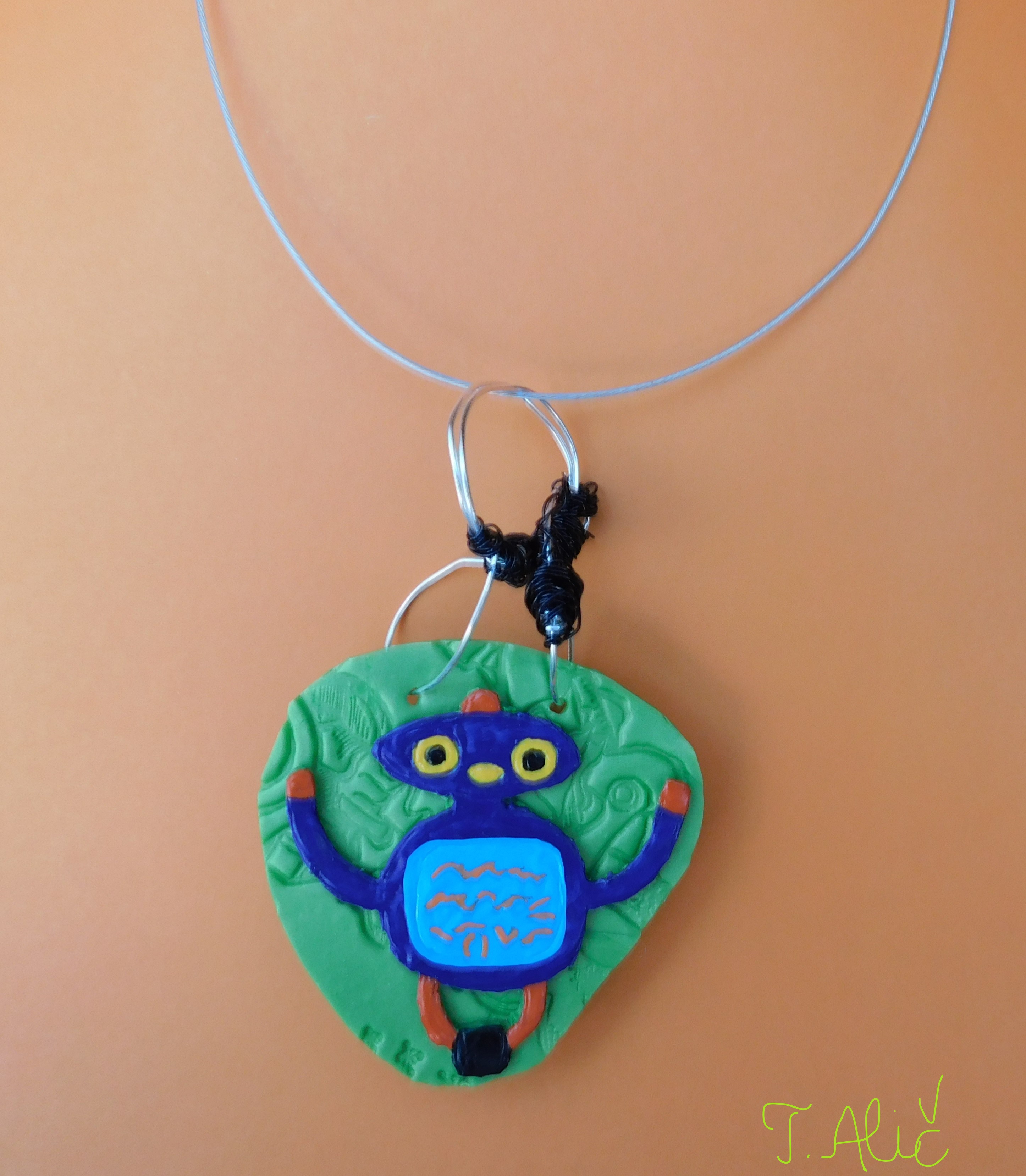I made this necklace with green pendant and colorful design (robot) using polymer clay and acrylic paints.
