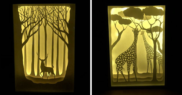 Love paper cutting and creates illuminated light boxes. I love creating something beautiful and share. All light-boxes start with an idea of image and drawing process. All art is belong to me including the wood boxes. When I can not find a wood box I place them into Starbucks cups :) you can see more works via instagram @lightofpaper