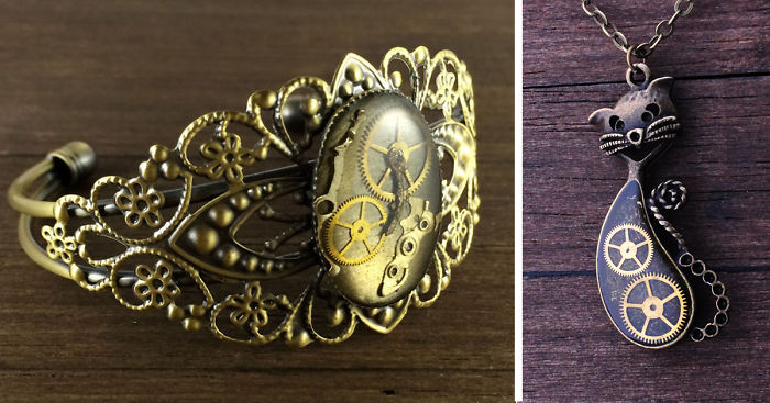 All jewelry is made by hand, using tiny, real wristwatch and pocket watch parts (gears, cogs, arrows, wheels, bridges, springs etc.). They are positioned in an antique brass, copper or bronze-colored base and sealed with a transparent resin which comes out as glass. The result seems almost eternal.