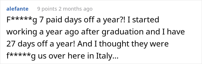 Load More Replies...The US is HORRIBLE when it comes to vacation. Not only are our businesses stingy about how many days you get, but there is so much resentment from your boss and coworkers when you actually take your vacation days because our companies never hire enough people to make it easy to cover for anyone who's out. You're expected to schedule your vacation when it's convenient for everyone else, and they still make you feel guilty, like you're being lazy for not coming in. The "Puritan work ethic" is a nightmare that needs to die.