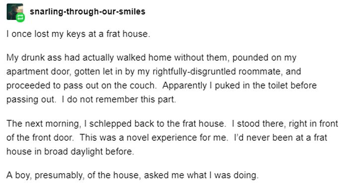It’s not all goofy, drunken antics though. This story, presumably written by an English major, shows that frat boys can sometimes put their naive enthusiasm to genuinely good causes, and save the day for people in need. This girl puked and passed out after a frat house party (all pretty standard so far), and had to go back next day for her keys. What happened next might just restore your faith in frat boys. Scroll down below to check it out for yourself, and let us know what you think in the comments!