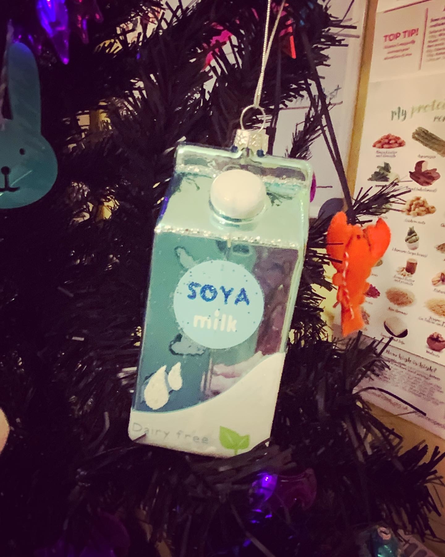 Every year i try and find the weirdest most random decorations for my tree 😂 this year i had decorations shaped like lobsters, squids, sprouts, cartons of soya milk, ghosts and a rainbow shrimp on top 🤣