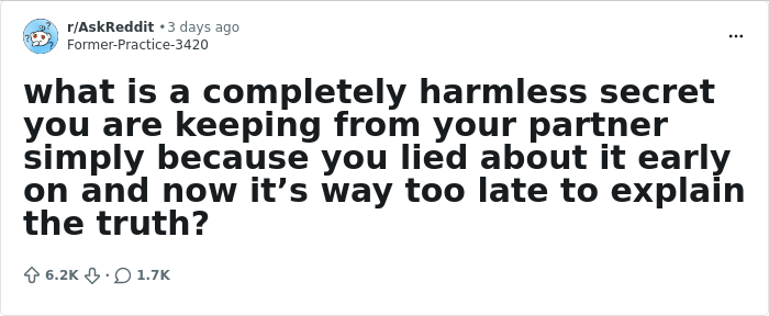 Redditor Former-Practice-3420 asked other platform users to share the harmless secret they’re keeping from their partner because they lied early on in the relationship, and the replies remind us that biting your tongue is an art we probably don’t practice nearly enough these days.