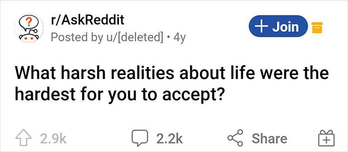 Reddit users have been opening up about the brutal realities of life that hit them the hardest, so we’ve gathered some of their most eye-opening and heart-breaking responses below. If you’re struggling with any of these ideas too, know that you’re not alone, pandas. Remember to upvote the pills that have been particularly hard for you to swallow as well, and keep reading to also find an interview with Louisa Davis, editor for The Mind's Journal. Then if you’re interested in diving even deeper into this topic, you can find another Bored Panda article featuring a similar discussion right here!