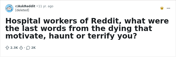But one thing we often forget (or don’t want to think about) is that we never know when we’re going to utter our final sentence. Nurses and doctors on Reddit have been recalling the most haunting last words they’ve ever heard from patients, so we’ve gathered a list of their heartbreaking stories below. From making final requests to expressing regret about their lives, these comments might give you the chills. But we hope this list reminds you to say whatever’s on your mind, as there might not be another chance to share again later.