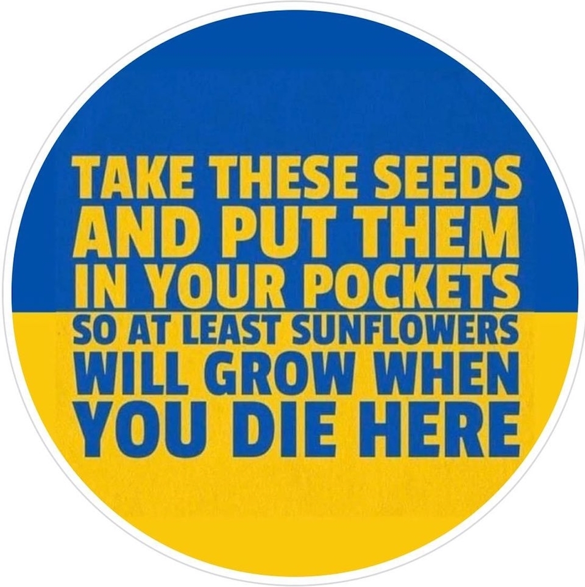 Sunflower seeds…..hmmmmm. I wonder if the entire world were to send Ukraine packets of sunflower seeds so the Ukrainians can hand them to the Russian aggressors with this women’s words printed on the packaged, it might just be enough to unnerve the soldiers and cause them to rethink their orders!! *hey, a poor, old, ugly, disabled girl needs to be able to dream, don't step on my grove here.