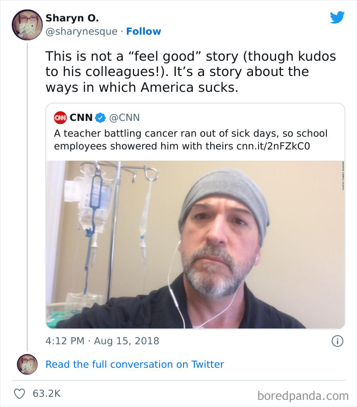 Once you think about it for more than two seconds, you realize just how messed up the stories really are. Like features about coworkers donating their time off to a seriously sick colleague. Or people teleworking from the hospital. Or posts about kids starting up businesses to pay off someone’s debt. It really makes you think that these acts of kindness wouldn’t be needed if society prioritized different things.