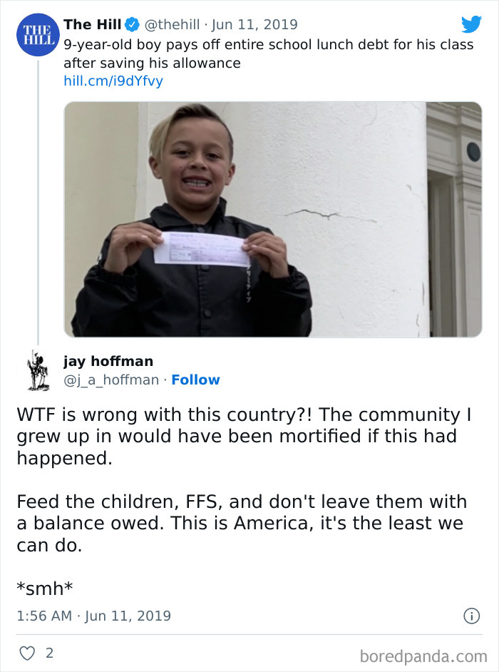 A civilized country would make sure no child has such a ridiculous thing such as "lunch debt" - feed them all! At no cost to them or their families! But then, you don't give a damn whether they have to defend against a shooter, so why the f**k would you care if they can eat or not, eh? I apologize for the rant, I am so disgusted with my country lately.