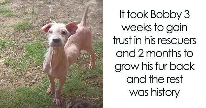 It took Bobby 3 weeks to gain trust in his rescuers and 2 months to grow his fur back and the rest was history