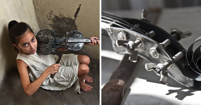 My niece weighs as much as this HEAVY METAL violin with the bow… Look at the details. The violin bow is a hacksaw… the keys – butterfly nuts.