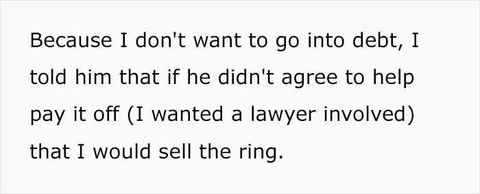 Why does she have to worry about his family being upset? Isn’t that something he should worry about and keep his word and help pay for the cancelled wedding since it was cancelled because of him? Then she never would of sold the ring to begin with. He basically forced her hand cause who wants to be cheated on a month before the wedding AND be in debt for 20k for something that didn’t happen? While the asshole gets away scott free. Come now…that ain't right.