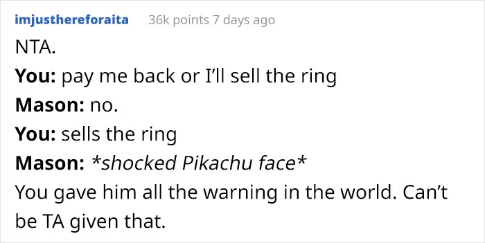 So while some Redditors commented that the author is NTA, saying that “if you don’t want to lose a valuable family heirloom, don’t give it to someone and then cheat on them.” Others really couldn’t decide, thinking that both partners were at fault here. However, many of them were truly concerned about the legality of it all.