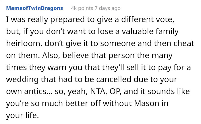 Load More Replies...Don't gift a valuable family heirloom to someone you're gonna cheat on. I saw this elsewhere and someone said it's a conditional gift, he broke the conditions so it's hers. Not sure how true that is though. The worst decision here is getting yourself into debt for a wedding.