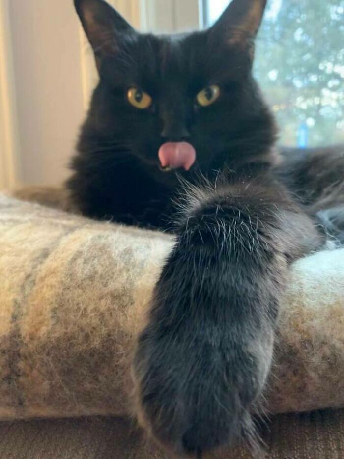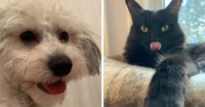 The dogs name is Wookie(pookser,potato…), the fluffy black cats name is poly (also known as poly bear,floof butt…) and the multicolored cat is midge (midgie bear).
