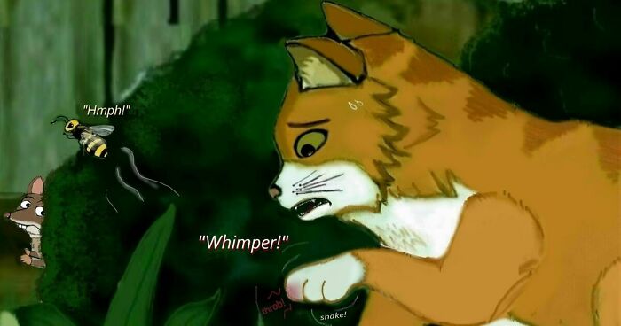 Yes, Leo would try to push his luck with a wasp, or any little critter. But let’s face it…sometimes cats can be jerks! Then face the consequences! As for the rat, I’m sure most of you will recall all how Leo chased him off, which provoked the snake into coming after him. And Samson came to the rescue, saving his life. (Comic is below. Named, “The Intervention.”) Well, the little rodent never forgot. As for the dandelion, yes it does actually soothe bee stings! But it would be temporary…and of course, Karen would either bring him to the vet or treat him herself.