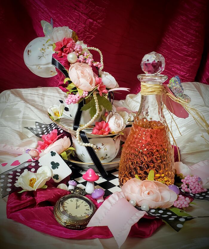 Beautiful Alice in Wonderland-themed centrepiece. Stacked teacups are securely mounted on wood painted with black and white checkers. Adorned with garden roses, berries, ranunculus, ribbons, a miniature Cheshire cat + door knob, playing cards pocket watch, miniature mushrooms, and a string of pearls.