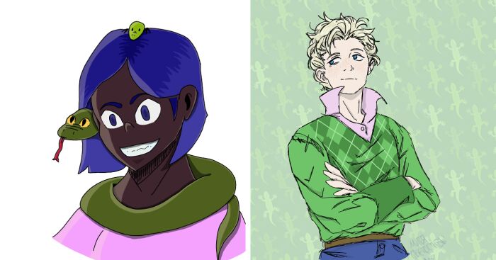 Color palette: Deep blues, cream colors pinks, and whites. Short hair, tall, soft aesthetic, theme around reptiles and ivy. the rest is up to you!