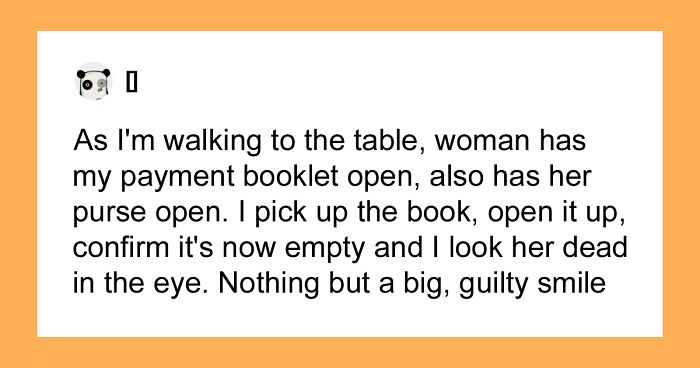 Next customers come in (~40ish man/woman couple), are sat at table immediately before I can get to it. As I'm walking to the table, woman has my payment booklet open, also has her purse open, frantically flinging her hands into it. I approach. She quickly closes the book and puts it back in the center of the table.