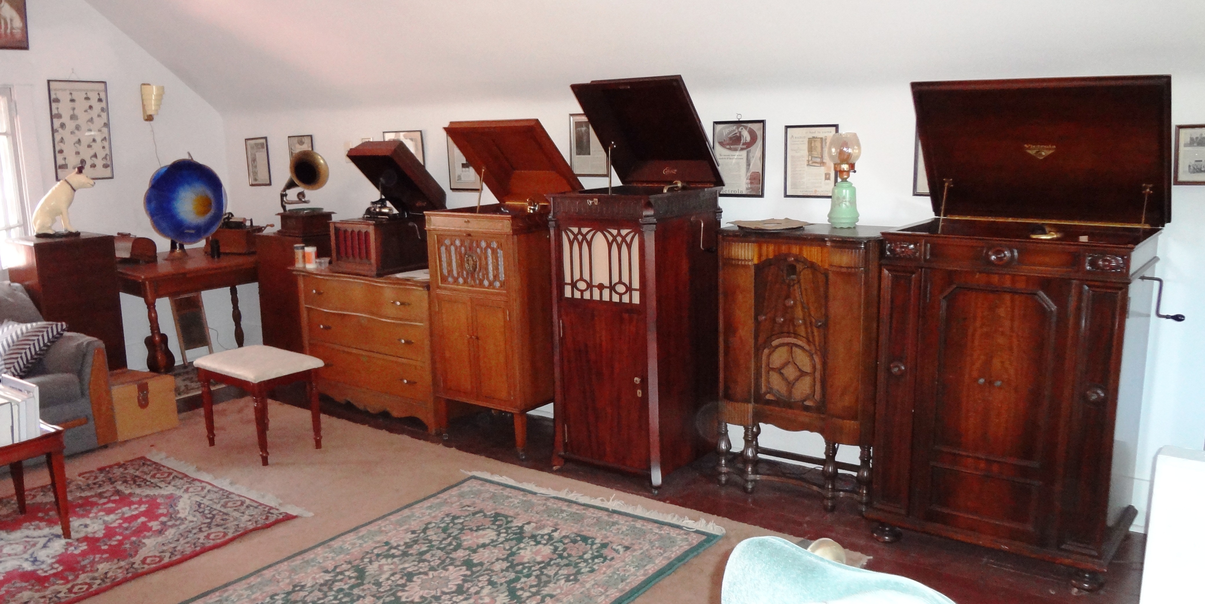 Left to right: Edison Standard Cylinder player (circa 1905), Victor II Disc phonograph (circa 1900), Edison Amberola Model 50 Cylinder phonograph (1923), Silvertone Graphonola (circa 1917), Edison "Laboratory" Chippendale Diamond Disc player (1917), General Electric Radio (circa 1927), Victor Credenza Orthophonic Phonograph (1925).