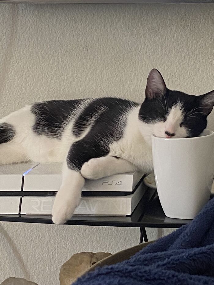Hopefully that cup isn't full of liquid, it's dangerously near to that PS4 lol