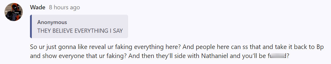 Wade, aka DP, is a troll who used to be friends with the pandas of this site until he showed his troll colours of queerphobia and eventually even supported Toast (the troll [edit: who we thought was] framing Nathaniel) in mocking the user Lusion for committing suicide.