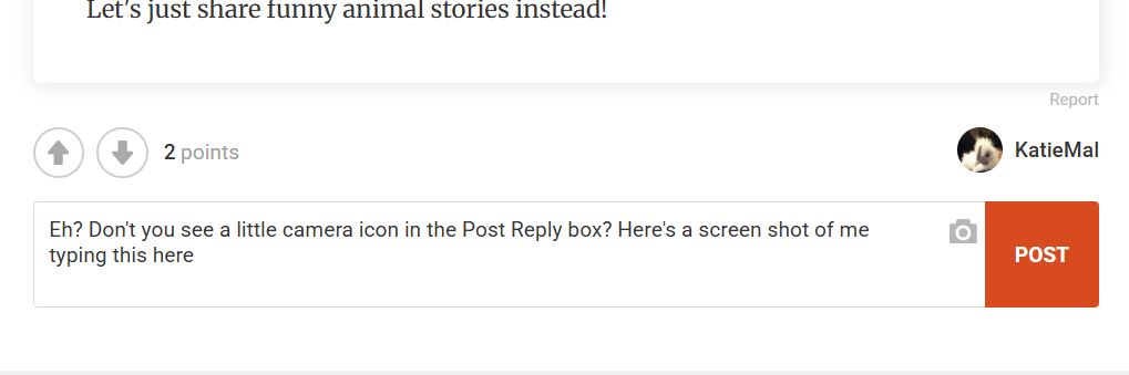 Eh? Don't you see a little camera icon in the Post Reply box? Here's a screen shot of me typing this here. Just click the icon and it will prompt you for an upload file destination. Clipboard0...ca714f.jpg Clipboard01-68c40caca714f.jpg . . . EDIT: Sorry, just realised this isn't there in the main Add Your Answer section, so yeah, someone's screwed up somewhere I think.