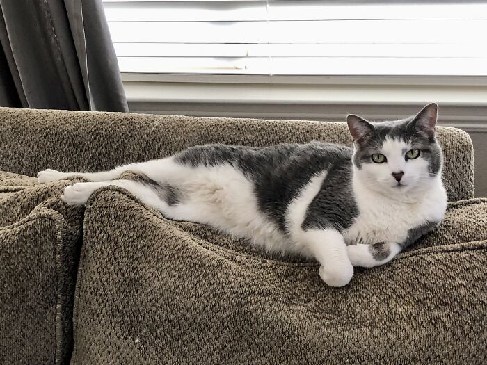 This guy randomly showed up on our doorstep shortly after a thunderstorm last August. He was a tiny little guy and looked so sad. I had to bring him inside. He's a lot bigger now, has a massive catitude, and he will never have to live outdoors again.