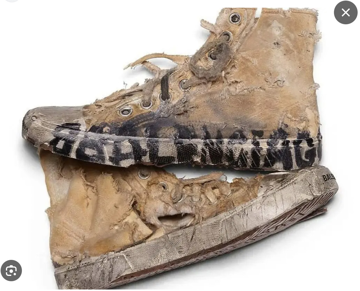 Deliberately ruined clothes. I have no problem with ripped jeans, I think they can look pretty cool, but... almost $2000 for a pair of shoes that look like they just got pulled out of a dumpster?