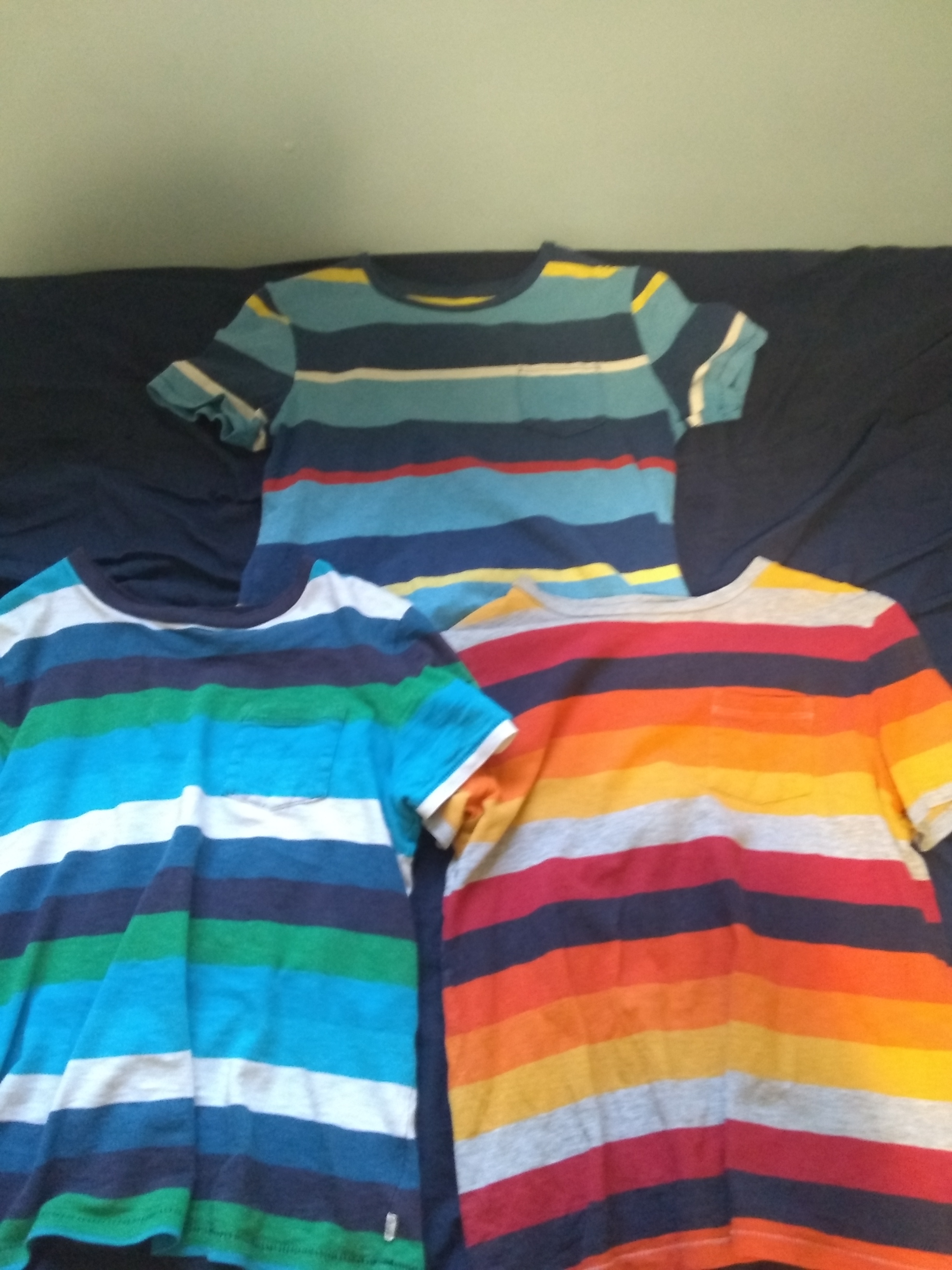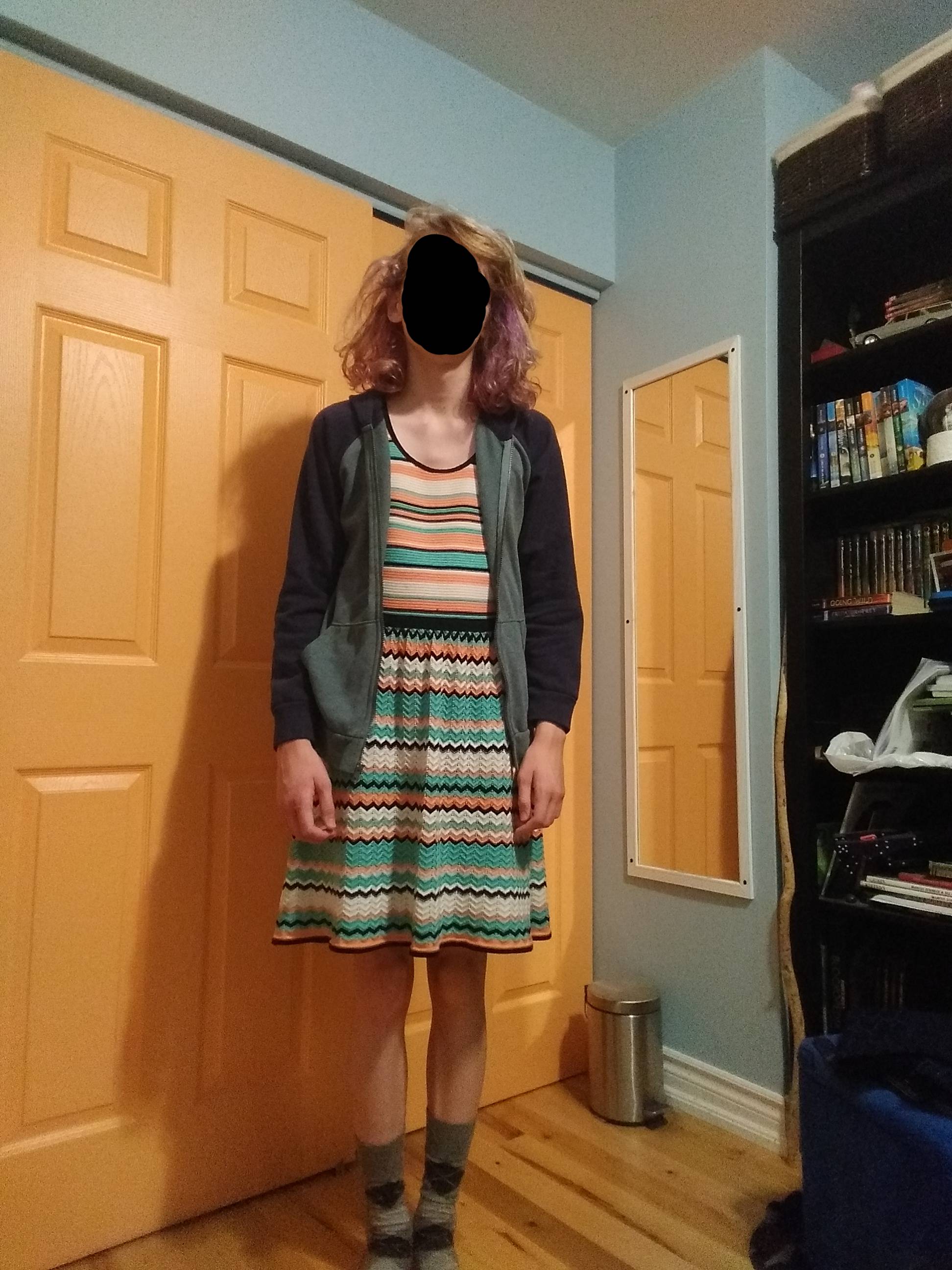 I don't have many clothes that I really like because women's clothes don't fit and men's clothes are boring so I mostly just wear a shirt with horizontal stripes and black or grey pants or shorts (they can go with most tops). My favourite outfit that I have is a dress with orange, turquoise (I am not sure what colour it is) and white stripes, it has no sleeves and at the waist the pattern changes to zig zags, it stops at about my knees and I like to wear pants underneath, (I don't know why that isn't a thing) I also like to wear a green and black sweater overtop, it looks great and it is great for different temperatures. I can even wear it in winter because of my pants!