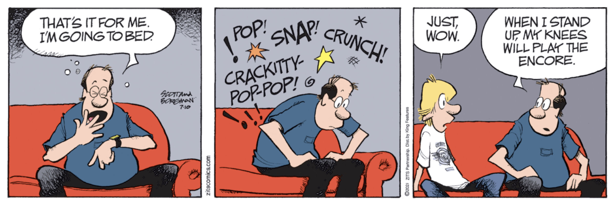 Once, years ago when I could still stoop down to get things from low shelves, I was in the grocery store, buying bananas. The green ones were on the lower shelves, and I squatted to select a bunch. Both knees popped like gunshots. The produce manager came over and asked "should I call an ambulance?" Nowadays my answer would be "yes please"