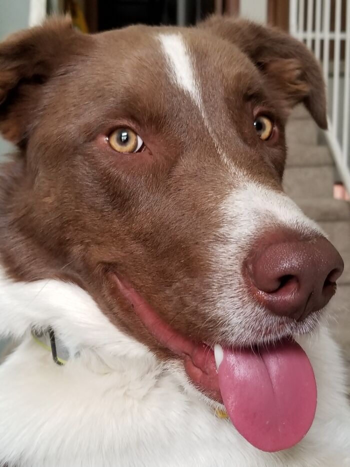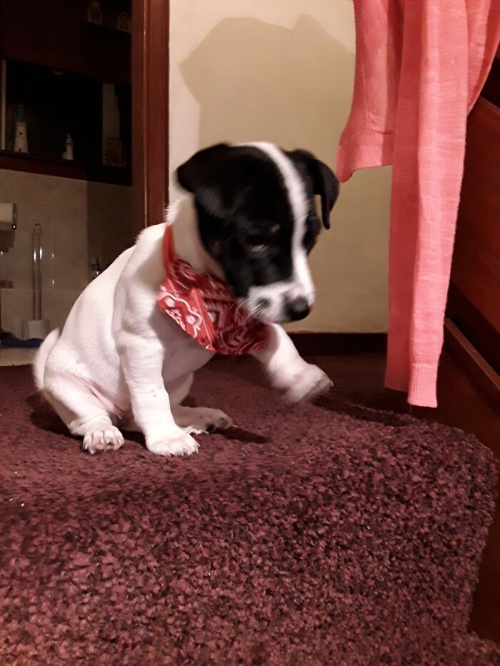 His dam ignored him when he was born, so he lived on our back porch for some time. One of the first things he had to do was learn how to climb up the stairs.