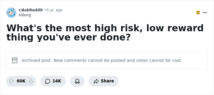 Nevertheless, hilarity often ensues when we do some reckless stuff. One netizen wanted to hear the wildest stories folks had about doing dangerous stuff that was ultimately totally not worth it. So, they asked: "What's the most h**h-risk, low-reward thing you've ever done?"