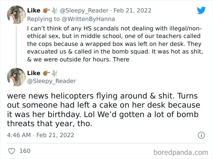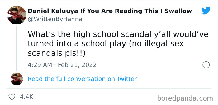 Speaking of teen drama, a Twitter user with the handle @WrittenbyHanna has shared a viral thread on the platform. She asked people “What’s the high school scandal y’all would’ve turned into a school play?” and it really hit a soft spot for many.