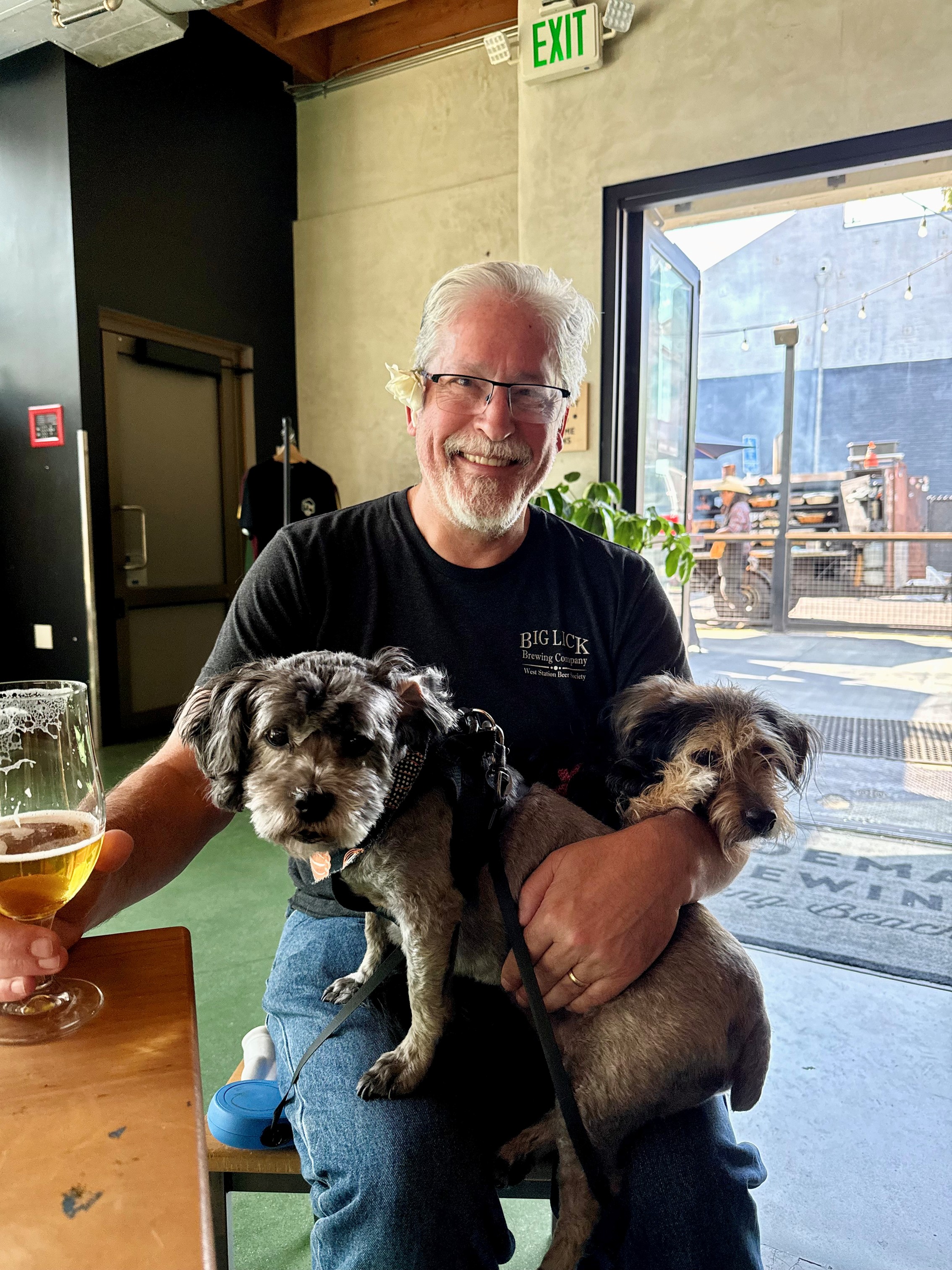 Dog owner sharing a funny meme on phone while waiting for a reaction, capturing relatable moments in pet humor.