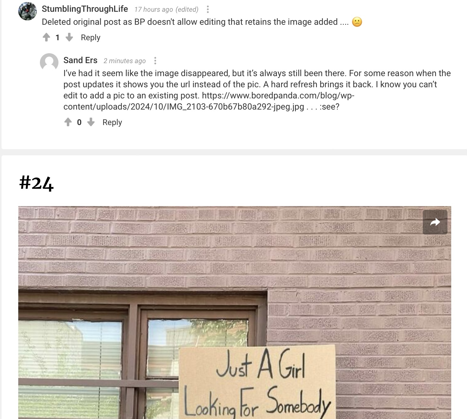 She quickly amassed almost a million followers, as folks across the world resonated with her witty commentary and female perspective on the “person holding a sign in public” type of content. We got in touch with her to learn more. So get comfortable as you scroll through, upvote your favorites and be sure to comment your thoughts below.