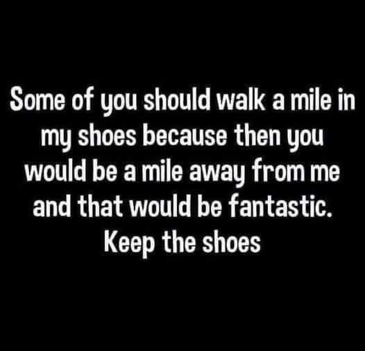 Load More Replies...You wanna walk a mile in my shoes?? It begins with a trip through my thoughts. You're not going to make it a mile after that.